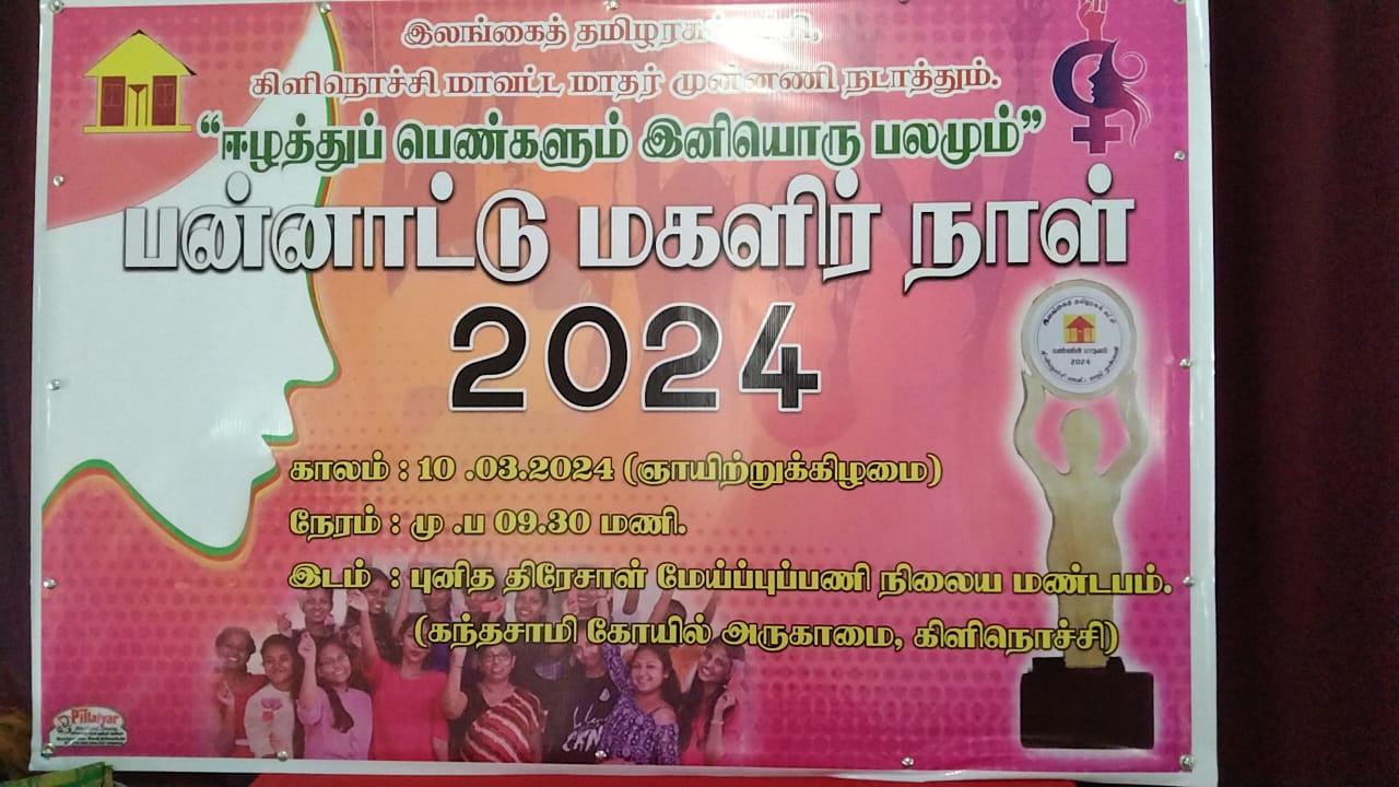 ஈழப் பெண்களும் இனியொரு பலம் எனும் தொனிப்பொருளில் இலங்கை தமிழரசுக் கட்சியின் மகளிர் முன்னணி ஏற்பாடு செய்துள்ள  மகளிர் தினம் இன்று கிளிநொச்சி புனித திரேசாள் மண்டபத்தில் நடைபெற்றது.